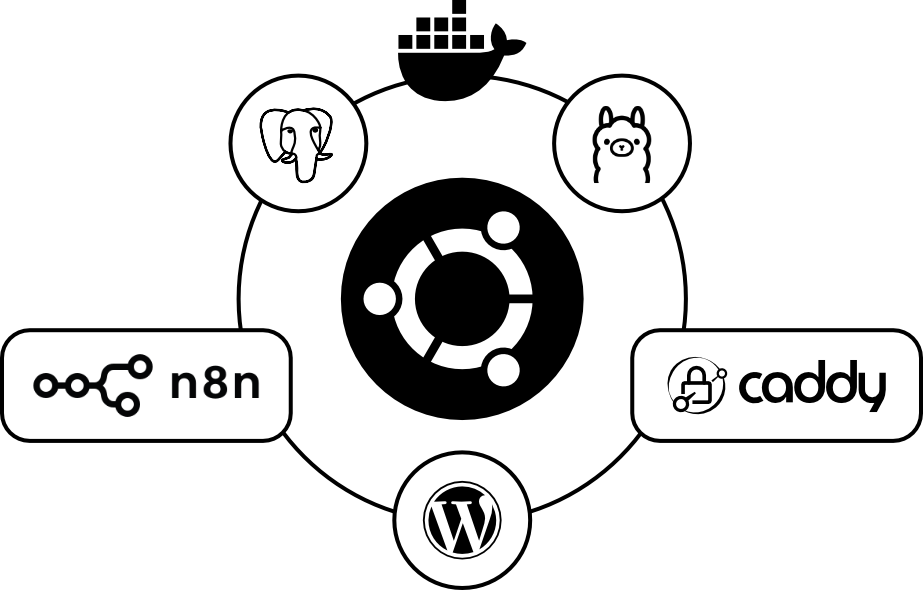 Installation von WordPress sowie n8n, Ollama, Postgres, Caddy mittels Docker.
